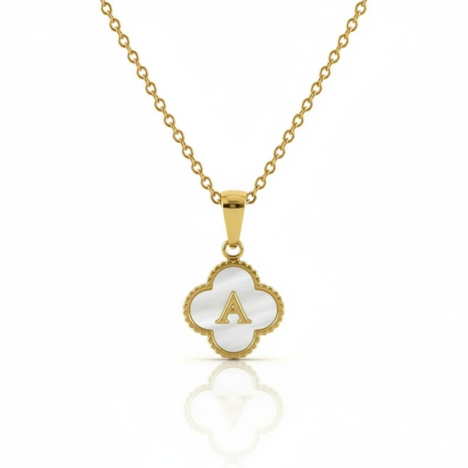 Este colar refinado combina elegância e personalização em um design delicadamente inspirado no trevo de quatro folhas da sorte. No centro, uma inicial de sua escolha se destaca orgulhosamente contra um fundo radiante de madrepérola, emoldurado por uma delicada estrutura dourada. Seu pingente em forma de trevo de quatro folhas simboliza sorte, tornando esta peça perfeita como um presente atencioso ou um amuleto pessoal de boa sorte.